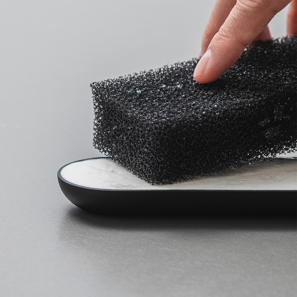 水で濡らして軽く絞ったスポンジの先端を1~2回こすりつけ、スポンジを数回揉むとよく泡立ちます。少量でたくさん洗え、長持ちする固形洗剤です。内容量100g。